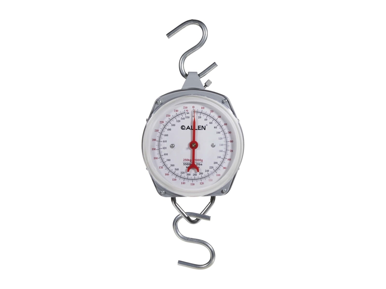 The Sportsman’s Scale by Allen® is a 550-pound capacity, adjustable tare weight scale that allows for a gambrel hanger when weighing game. The Sportsman’s Scale shows weights in pounds and kilograms.